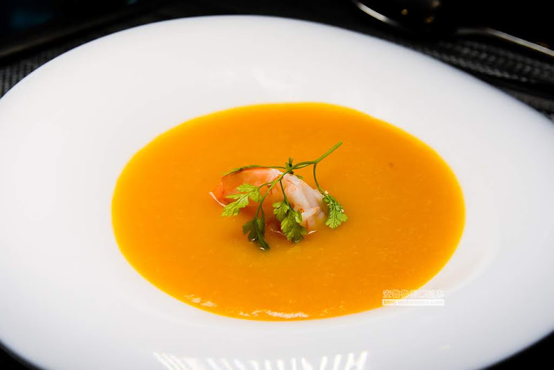 南瓜湯也和海鮮湯一樣,是由服務人員注湯,南瓜鮮豔的顏色在白色的盤子裡,面積越來越大,看得我猛吞口水