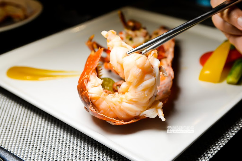 米其林指定食材、季節性提供加購、來自法國的藍龍蝦,在明水然也吃得到啦!藍龍蝦的肉質吃起來甘甜,比較軟嫩細緻,運氣很好的遇到滿滿蝦卵和蝦膏的藍龍蝦,一整個好滿足
