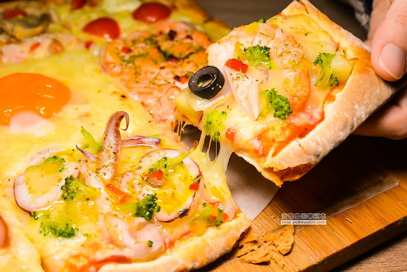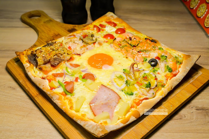 製作時間會較一般披薩久,從16種口味當中任選9種口味,每個披薩就像是為客人量身定做的,我們今天吃的有海鮮總匯、精選鮭魚、瑪格麗特、青醬透抽、有機半熟蛋、鮮菇燻雞、夏威夷、德式香腸、辣泡菜牛肉,那個鮭魚看起來好嫩喔!