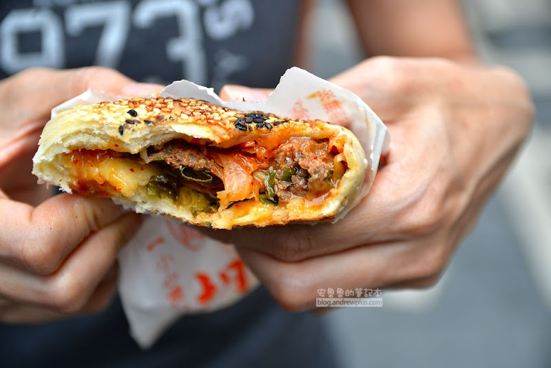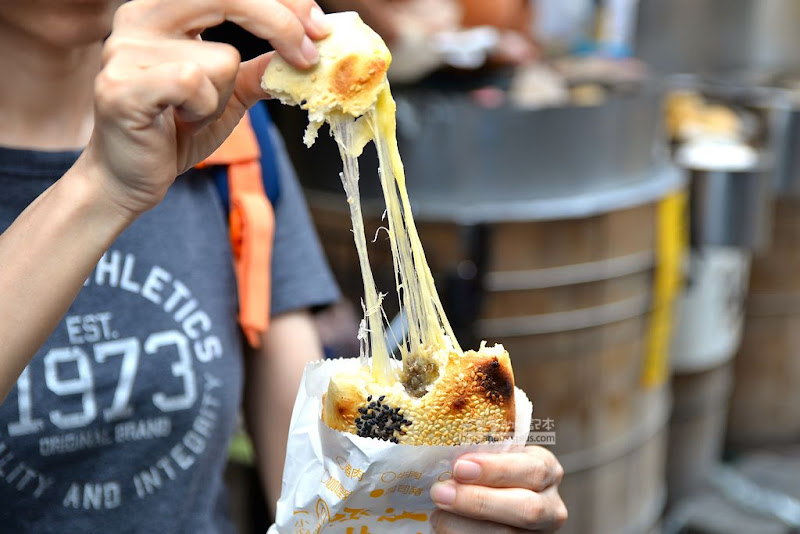 終於可以開吃!和基本款豬肉餡不同的地方是:起司取代了三星蔥,不吃蔥的同學可以選擇起司豬或起司牛,瞧瞧這邪惡的起司可以拉絲拉這麼長哩!