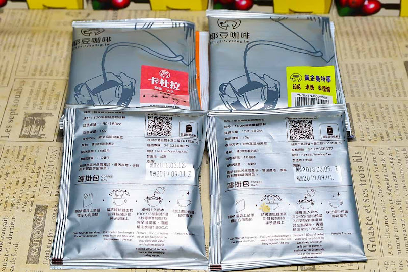 打開包裝盒,兩包銀色的是正常版的包裝;兩包有小狗狗插畫的是耶豆咖啡新推出的 旺旺系列精品濾掛包,一共有六款咖啡豆,有興趣搜集可愛小狗插畫的朋友,可以上官網去查看旺旺系列精品濾掛包禮盒組